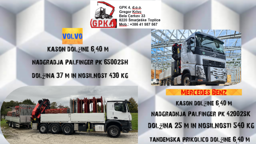 - MERCEDES BENZ kamion s kesonom dolžine 6,40 m, opremljen z dvigalom Palfinger PK 42002SH. Dvigalo omogoča dvigovanje do 25 m in nosi bremena do 540 kg.