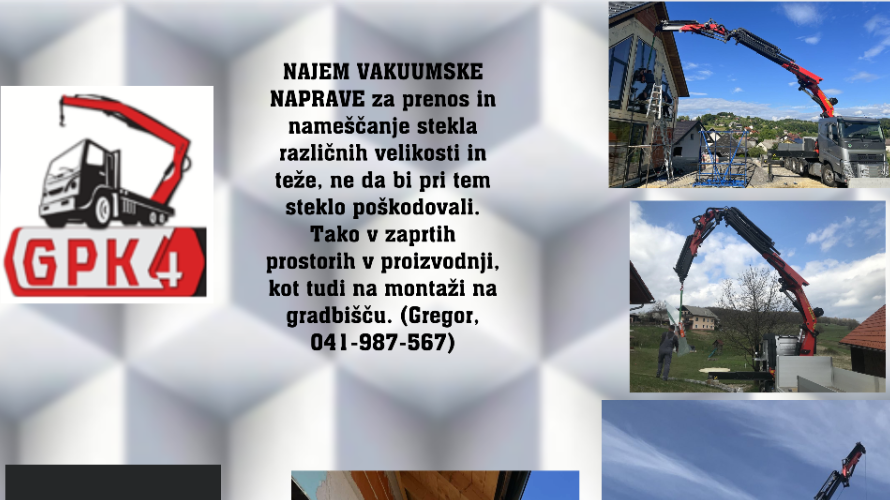 - Najem vakuumskih dvigal za prenos in nameščanje stekla ter fasadnih panelov različnih velikosti in teže, brez poškodb. Primerno za proizvodnjo in montažo na gradbišču.