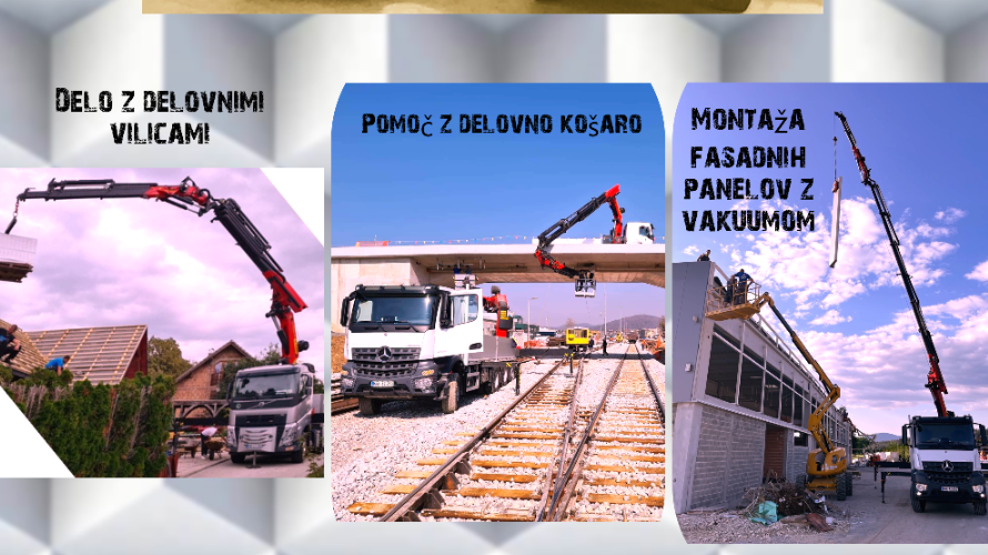 Nudimo najem tovornih vozil z dvigali za različna opravila, vključno z dvigovanjem strojev, težkih bremen, vakuumskim dvigovanjem stekel, fasadnih in strešnih panelov, dvigom oseb z delovno košaro, dvigovanjem strešne opeke z delovnimi vilicami. Poleg tega ponujamo delo z grajferjem in prevoz s tandem prikolico dolžine 6,40 m.