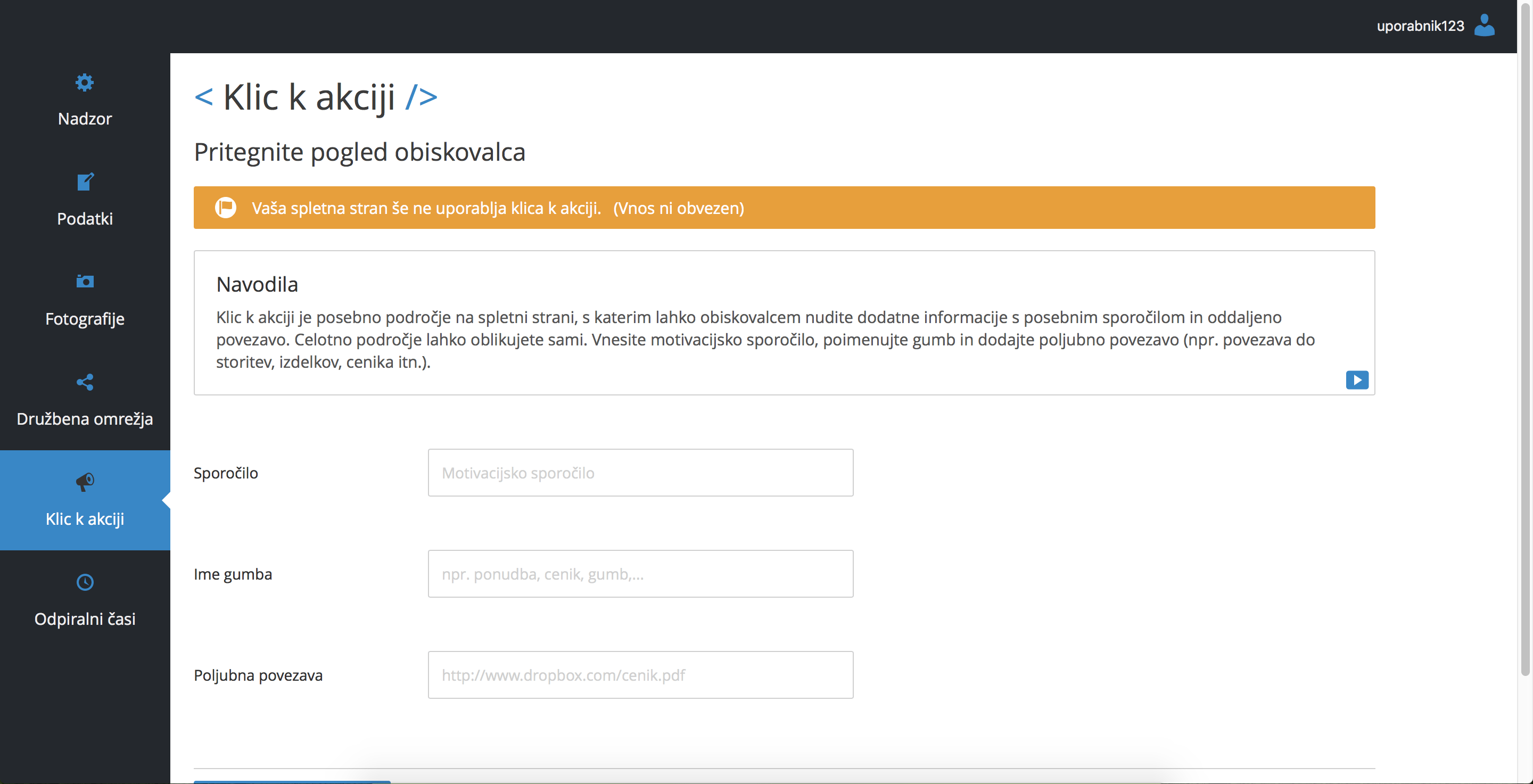 Klic k akciji je namenjen zunanji povezavi, na katero lahko pošljemo uporabnika. Če imamo dodatno spletno stran, mogoče spletno trgovino, lahko uporabnika preko klica k akciji napotimo na naše prodajno mesto. Mogoče imamo svoj YouTube kanal in želimo, da uporabnik pogleda še tja, ali pa želimo še bolj izpostaviti naš Facebook profil in uporabnike dodatno napeljujemo, naj ga obiščejo. Ker pa sama povezava ne deluje najboljše, jo lahko spremenimo v gumb in ji dodamo še opis. Področje Klic k akciji ni obvezen, zato lahko ta korak preskočite.