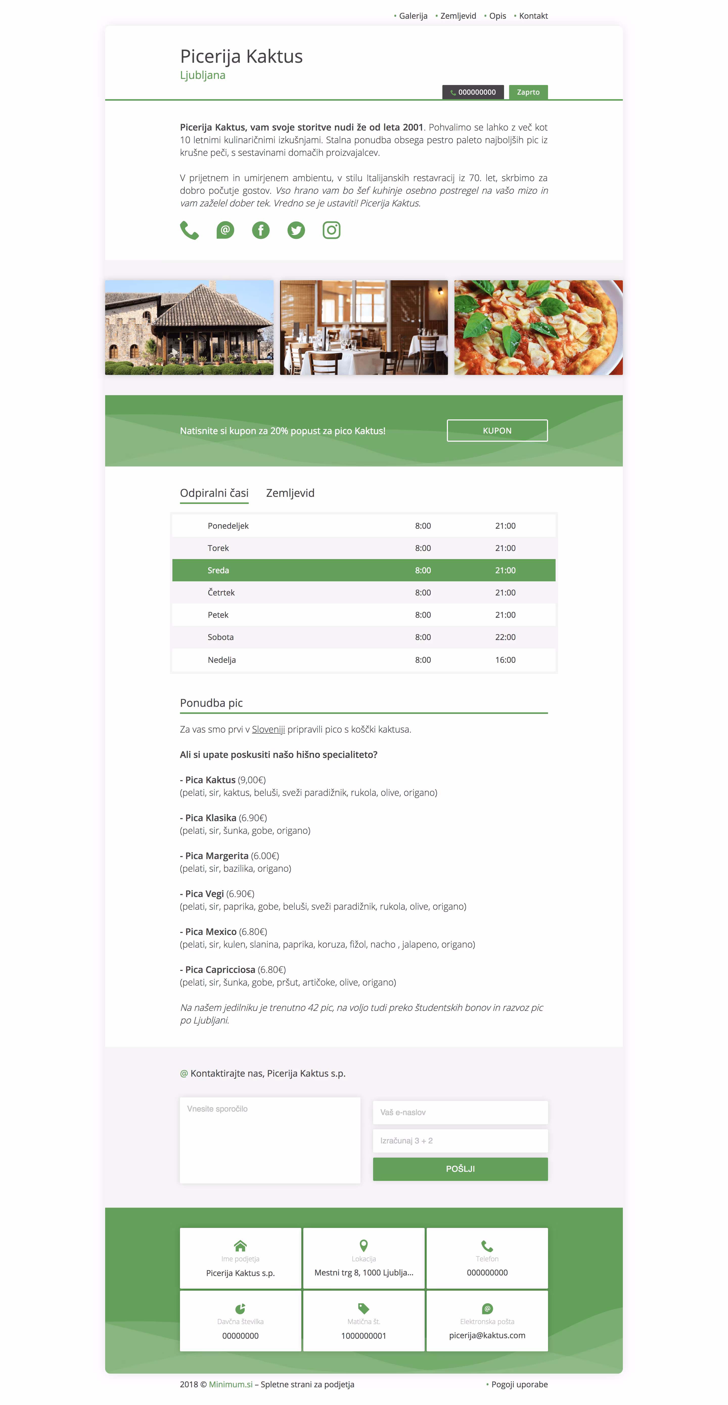 Prepoznavnost vsebin je naša najvišja prioriteta, iz istega razloga vse Minimum strani uporabljajo enako (eno) predlogo. Uporabnik tako ob obisku dveh popolnoma različnih podjetij (ali več) že pozna lokacijo informacij.